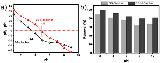Figure 5. (a) Zeta potential of SB-Biochar and SB-N-Biochar; (b) the effect of pH on the removal of RO-16.