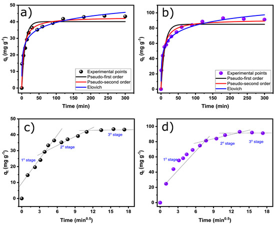 Figure 6. Kinetic curves of RO-16 adsorption onto biochars. SB-Biochar (a,c); SB-N-biochar (b,d).