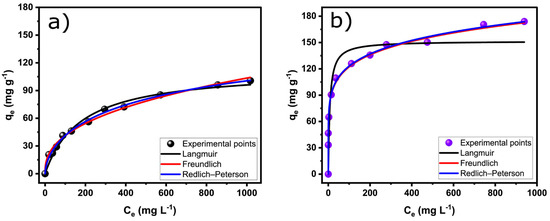 Figure 7. RO-16 equilibrium curves for SB-Biochar (a) and SB-N-Biochar (b).