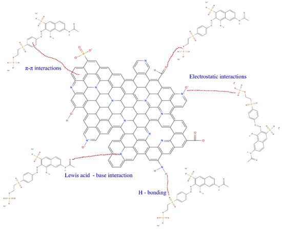 The mechanism of adsorption is graphically represented in Figure 8. Since the biochars have high specific surface areas, one of the dominant mechanisms of RO-16 adsorption is related to the pore-filling mechanism, achieved through the diffusion of the RO-16 molecules into the porous network of the biochars. In addition, the surface functionalities on the biochars’ surfaces play an important role in attracting and binding the RO-16 molecules [18,43,44]. The O-containing functional groups (hydroxyl and carboxyl groups) could act as an H-bonding donor to form hydrogen bonds with the RO-16 molecules [18,43,44]. Another mechanism acting on RO-16 removal can be seen in the Lewis acid-base interactions between N-doped biochar and RO-16; the N-doped biochar has N states (pyridinic-N, pyrrolic-N, and graphitic-N) and N functionalities that might donate electrons (N- and O) and act as Lewis bases [44]. Another important mechanism is seen in the electrostatic interactions. N doping creates positive clouds on the biochar carbon framework due to the electronegativity differences between carbon (2.55) and nitrogen (3.04), which enhance the electrostatic attraction of anionic dyes such as RO-16 [18]. During the doping process, nitrogen atoms withdraw the π-electrons from the biochar’s graphene layers, generating positive sites that act as acceptors of the π-electron and interact with the aromatic rings of the dye molecule (π-electron-enriched).