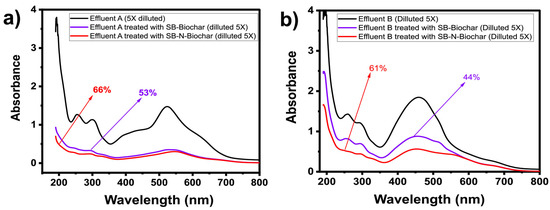 For effluent A, the removal capacities were 53% and 66% for SB-Biochar and SB-N-Biochar, respectively. For effluent B, the removal capacities were 44% and 61% for SB-Biochar and SB-N-Biochar, respectively. As discussed previously, the SB-N-Biochar demonstrated better adsorptive performance compared to SB-Biochar, while for the effluent treatment, the doped sample also exhibited better adsorptive properties. Taking into account the fact that both synthetic effluents are complex, concentrated mixtures of dyes and other compounds, it can be suggested that both adsorbents could be successfully employed in the treatment of real-world colorful effluents.