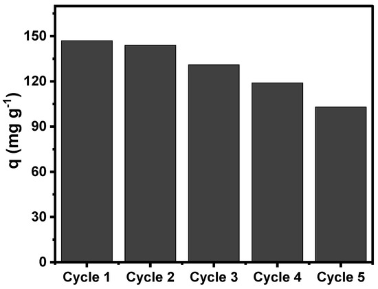 Figure 10 illustrates the desorption-adsorption cycles of RO-16 onto the SB-N-Biochar sample. It was observed that the adsorption capacities of the biochar suffered a small decrease, but they still maintained very good sorption efficiency after five cycles, with a reduction from 147 mg g−1 at the first cycle to 103 mg g−1 at the end of the fifth cycle. These results strongly indicate that the N-doping process yielded an adsorbent with satisfactory recyclability that could be used multiple times. This makes the process more sustainable and environmentally friendly.