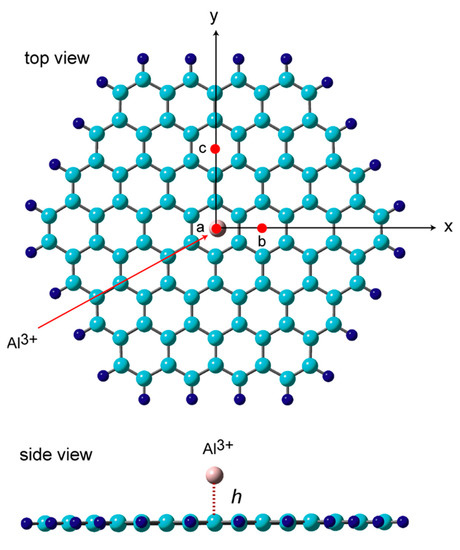 The optimized structure of GR37-Al3+ calculated at the CAM-B3LYP/6-311G(d,p) level. h means height of Al from GR surface: height is defined as vertical distance of Al from GR surface. Points a, b, and c mean hexagonal sites of Al on GR. x-axis and y-axis mean diffusion paths of Al on GR.