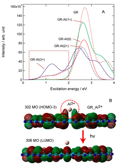 Simulated absorption spectra of GR (without Al), GR-Al, GR-Al+, GR-Al2+, GR-Al3+ are given in Figure 2A. The calculations were carried out at the CAM-B3LYP/6-31G(d) level with GR37. The spectrum of GR (without Al) showed that the peak is located at Eex = 2.70 eV, where Eex means excitation energy. There was no absorption band in the ranges of 0.20–2.00 eV (hatched region: low-energy region). In GR-Al+, a single peak spectrum (Eex = 2.60 eV) was obtained as the UV band, as well as that of GR (without Al). In contrast, a low-energy band newly appeared in GR-Al3+ in the range 0.2–2.0 eV (the peak is located at 1.27 eV) in the hatched region, and GR-Al3+ has a UV band with a peak at 2.42 eV. In cases of GR-Al2+ and GR-Al, the shoulder bands appeared in the low-energy region (0.2–2.0 eV) with the peak of 1.17 eV. These results suggested that a new lower-energy band is generated by Al’s doping to GR, except for GR-Al+.