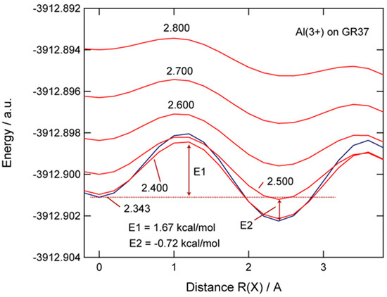 The diffusion barrier was calculated to be 1.67 kcal/mol for Al3+. Similar calculations were carried out for the y-axis direction. The y-axis energies were significantly higher than those for the x-axis, indicating that the diffusion along the x-axis direction is energetically favorable in GR-Al3+.