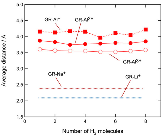The distances were almost constant (3.53–3.60 Å) in GR-Al3+. In Al+ and Al2+, the distances were longer than those of GR-Al3+: 3.75–3.85 Å for GR-Al2+ and 4.05–4.22 Å for GR-Al+. For comparison, the average distances of GR-Li+ and GR-Na+ are also plotted in Figure 5: 2.15 Å (Li+) and 2.47 Å (Na+). These values were significantly shorter than those of GR-Al. The interaction of the binding nature in the M = Li+ and Na+ systems is very different from that of GR-Al. In the former systems (Li+ and Na+), the ion-induced dipole interaction is dominant. In contrast, van der Waals (vdW) interaction is the main force in GR-Al.
