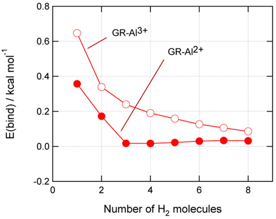 The addition of H2 to GR-Al proceeds, and the H2 + GR-Al → H2-GR-Al addition reaction is exothermic when Ebind(H2) is positive. Additional calculations were carried out at the same level of theory for Al+, Al2+, and Al3+ systems. We previously investigated interactions between graphene and various molecules using DFT at the same level of theory [27,28,29,30,31]. A similar technique was used for the GR-Al-(H2)n system in this study.