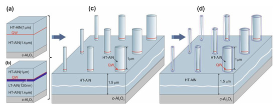 - Vermeersch, R.; Jacopin, G.; Castioni, F.; Rouvière, J.-L.; García-Cristóbal, A.; Cros, A.; Pernot, J.; Daudin, B. Ultrathin GaN quantum wells in AlN nanowires for UV-C emission. Nanotechnology 2023, 34, 275603. [Google Scholar] [CrossRef] [PubMed]