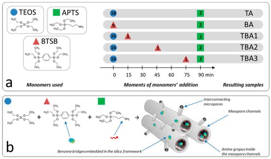 Scheme of the synthesis routes used in this study to obtain the resulting samples: synthesis protocol (the numbers inside the figures indicate the amount of added mmols for the relevant monomer) (a) and schematic presentation of the co-condensation reaction of three monomers (i.e., TEOS, BTSB, and APTS) used to obtain the TBA1, TBA2 and TBA3 mesoporous silicas (b).