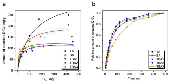 Adsorption isotherms and their fitting with the Langmuir model (a) and release profiles of DICL from the samples studied (b).