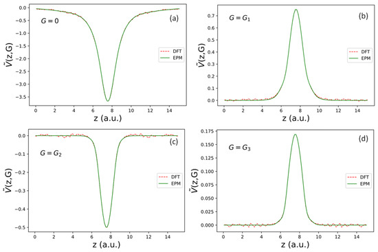 where denotes an in-plane 2D reciprocal lattice vector. The first term in Equation (14) denotes the main part of the local pseudopotential (denoted parametrized in terms of three spherical Gaussian functions, with and being fitted parameters. Namely, . and are related to the spatial average of in the 2D plane as a function of . We can rewrite in terms of 2D plane waves as the following: