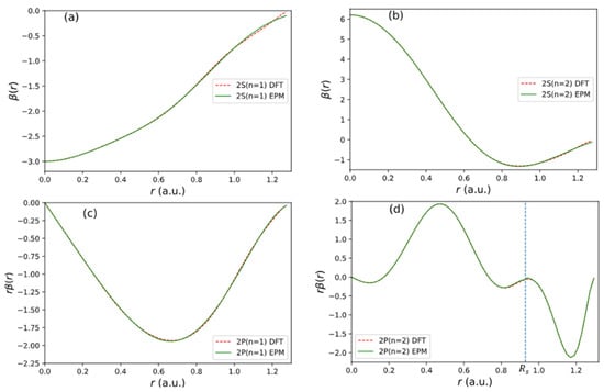 For the second 2P orbital (2), we break the function into two segments with a dividing radius at (indicated by a vertical dashed line in Figure 5d). We fit the first segment (seg 1) for by expression (32). For the second segment (seg 2), we fit with the following expression: