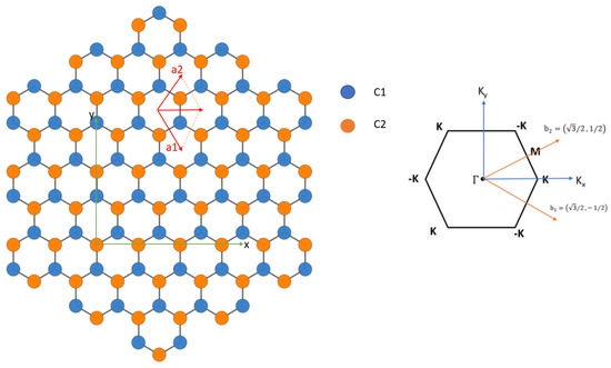 and is given in Equation (A2). , with the lattice vectors running through all graphene unit cells within the area . Here, corresponds to the origin marked by a red cross in Figure 8a.