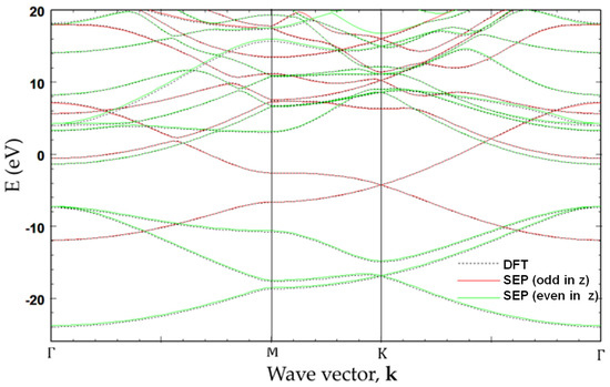 It is seen that the result obtained by SEP matches the corresponding DFT results very well. In Figure 3b, we show both the x- and y-dependence of at along lines in x- and y-directions, with both passing through the center of the hexagon cell. The agreement with the DFT results is still very good, except there is a small deviation near the center (. We also noticed that the x- and y-dependence almost coincide for , indicating the potential has nearly cylindrical symmetry near the center of the hexagon cell. We then took the difference of the local potential obtained by DFT and by SEP and plotted the difference function in Figure 3c. It turns out that such a minor correction will still be important for the states derived from the -bonds, but it has a negligible effect on states derived from the -bonds since the -orbitals have negligible amplitude at the center of the hexagon cell. This minor correction is caused by the fact that all terms included in in Equation (21) are centered at atomic sites, while the effect of charge redistribution due to valence charges in the solid cannot be fully absorbed by the atom-centered terms. Thus, we should also consider contributions described by functions localized at the center of hexagon cells in the graphene lattice. We shall call such a term the “bond-charge contribution”.