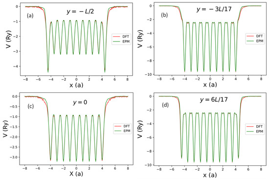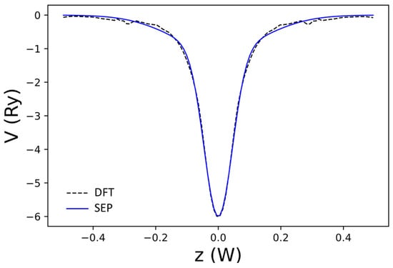 To check if the real space form of the local pseudopotential obtained by the current SEPs as given by Equation (21) can truthfully represent the DFT results, we compared the results for obtained by DFT and by the current method in Figure 3. In Figure 3a, we show the x-dependence of at and (a line passing through the center of a C atom). Here, is the grid size for the fast Fourier transform used in the DFT calculation, and is the width of the domain along the z-axis used to define the B-spline basis.