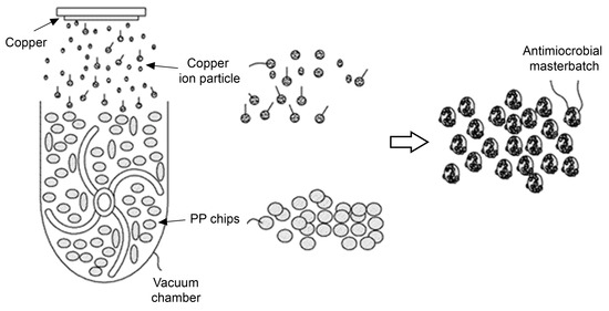 A test was performed to deposit and coat copper particles as an antimicrobial agent on a PP pallet to produce dust filter media. As shown in Figure 1, under the pressure of 10−5–10−6 Pa in a vacuum chamber, a copper plate of 20 cm × 10 cm × 1.5 cm was fixed to the upper part of the chamber. Copper particles were then deposited onto the PP pellets using a 65 kW high-voltage plasma. The resulting copper-deposited PP pellets were used as a masterbatch to fabricate antimicrobial dust filters.