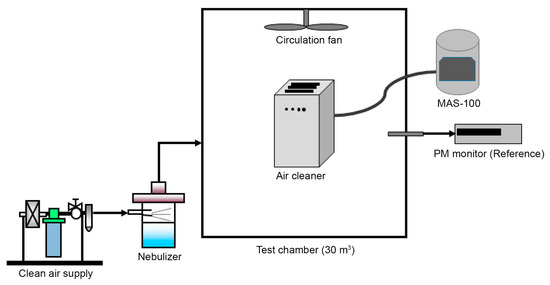 To verify the effectiveness of the antimicrobial filter in removing airborne bioaerosols in an air purification system, we measured the removal performance over time after suspending bacteria in a 30 m3 chamber, as shown in Figure 3. An air purifier with the antimicrobial filter was placed at the center of the chamber under the test environment at 23 °C and a relative humidity of 50%. To simulate real-life conditions, the test strain Staphylococcus aureus (Staphylococcus ATCC 6538) was sprayed inside. Subsequently, the initial airborne bacteria concentration immediately after spraying the test strain was compared with the airborne bacteria concentration after the air purifier was run. As a control test, the test strain was sprayed into the chamber without the air purifier, and the concentration of airborne bacteria was checked at the beginning and after the same duration as the runtime of the air purifier to test the removal performance of airborne bacteria in the chamber space.