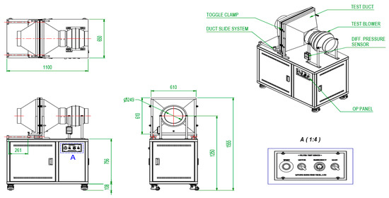 Regarding the safety of the antimicrobial dust filter, an emission test was performed on a filter coated with the antimicrobial agent in accordance with the regulations for testing household chemical products subject to safety checks, as outlined in the National Institute of Environmental Research’s notification No. 2021-12. A 30 cm × 30 cm filter was installed in the wind tunnel (Figure 4) and continuously operated for 96 h with an operating flow rate of 10 m3/min. The emission quantity of the antimicrobial agents was determined by analyzing the content of the antimicrobial agents in a conventional filter and the tested filter, and the reduction in the content of antimicrobial agents was obtained. The antimicrobial content was measured before and after the filter test using a mass spectrometer.