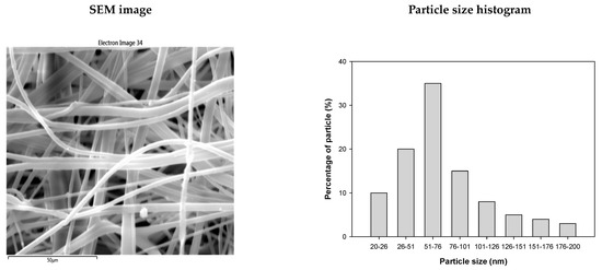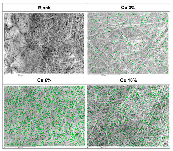 The 1000-fold magnified SEM image depicted in Figure 6 reveals the presence of copper particles coating the filter medium, achieved using the masterbatch. Copper particles with a size of 20–200 nm were coated on the fiber surface.