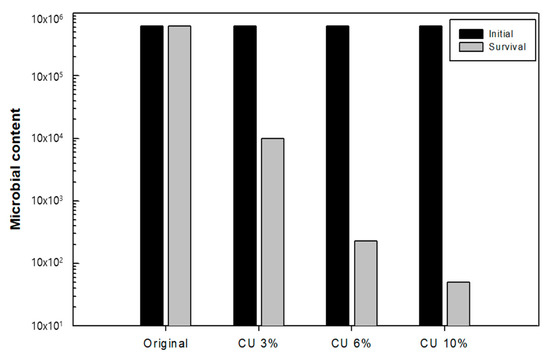 After confirming the distribution of antimicrobial copper particles in the dust filter media, the antimicrobial effect was evaluated based on the treatment concentration of the antimicrobial agent. As shown in Figure 8 and Table 1, the masterbatch content of 3% with the copper-deposited antimicrobial agent exhibited an antimicrobial effect of 98.3% in the antimicrobial test. An excellent antimicrobial effect of 99.9% was confirmed in the melt-blown medium that used 6% of the copper-deposited masterbatch, while an excellent bacterial reduction rate of >99.9% was confirmed in the melt-blown medium that used 10% of the copper-deposited masterbatch. Overall, a good antimicrobial performance was observed in the melt-blown medium that used >6% of the copper-deposited antimicrobial masterbatch.