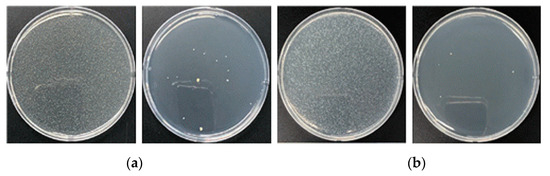 To further verify the antimicrobial effectiveness of the antimicrobial dust filter fabric, additional antimicrobial tests were performed with Staphylococcus aureus (ATCC 6538) and Klebsiella pneumoniae (ATCC 4352) strains as target strains. The antimicrobial test was performed by inoculating the test strain onto 4 cm × 4 cm specimens of the antimicrobial filter media and then incubating them. Subsequently, the antimicrobial performance was assessed by monitoring the antimicrobial rate for 18 h after applying the test strain [11].