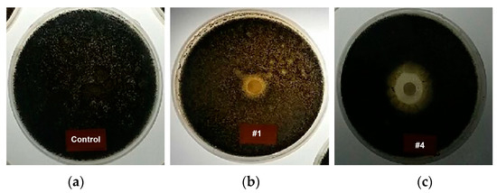 Photographs of antifungal activities using 6% antimicrobial agent mixed media. (a) Original, (b) zirconium, and (c) copper.