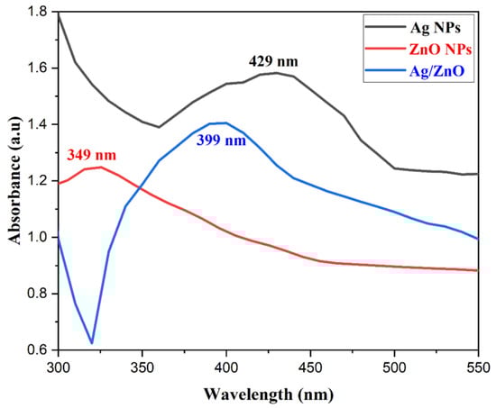 UV-Vis spectra of Ag, ZnO, and Ag/ZnO nanoparticles.