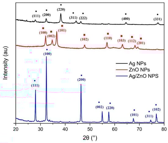 On the other hand, increased bacterial infections, the drug resistance of bacteria, and intolerable toxicity brought about by an enforcement of the high-dose administration of antibiotics have led researchers to approach nanotechnology-based therapeutics. Among all the metallic NPs, the most important are NPs of Ag [,,,], ZnO [,], and Cu []. In particular, Ag and ZnO NPs are very effective against pathogens when used in small quantities. Due to their environmentally friendly nature and non-toxic preparation procedures, these Ag and ZnO NPs are the best alternatives for several biological uses. Both show antibacterial, anti-fungal, and anti-cancerous properties. Thus, both Ag and ZnO NPs are important for mankind’s well-being, which contributed to the choice to use them in our study. The synthesis of Ag/ZnO bimetallic NPs has been performed in many physical and chemical ways, such as reduction via the solvothermal method, hydrazine hydrate, and ultrasonic irradiation, but biosynthetic methods are still missing [,,,,].