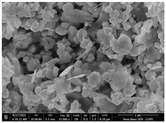 SEM was performed to investigate the morphology of the Ag/ZnO bimetallic nanoparticles. A representative image is presented in Figure 4, showing mostly spherical and well-dispersed particles with an average size of 397.5 nm. The observed particle size range is suitable for various advanced technological applications. Thus, Ag/ZnO bimetallic nanoparticles show desirable physical properties that make them potentially useful for various applications.