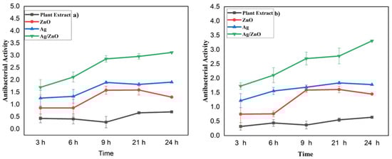 A time-killing assay was used to evaluate the antibacterial activity of the monometallic and bimetallic nanoparticles. The results are summarized in Figure 5. All the nanoparticles demonstrated antibacterial activity against the Gram-positive bacteria S. aureus, with the bimetallic Ag/ZnO nanoparticles showing the strongest activity. Specifically, at a concentration of 1.70 µg/mL after 3 h of incubation, the Ag/ZnO NPs killed more bacteria compared to the other samples, including the plant extract, monometallic Ag NPs, and monometallic ZnO NPs. The plant extract killed bacteria at a concentration of 0.43 µg/mL, the monometallic ZnO NPs at 0.86 µg/mL, and the monometallic Ag NPs at 1.26 µg/mL. After 6 h of incubation, the plant extract killed bacteria at a concentration of 0.41 µg/mL, the ZnO NPs at 0.86 µg/mL, the Ag NPs at 1.33 µg/mL, and the BNPs at 2.12 µg/mL. After 9 h, the plant extract killed bacteria at 0.28 µg/mL, the ZnO NPs at 1.58 µg/mL, the Ag NPs at 1.90 µg/mL, and the BNPs at 2.86 µg/mL. After 21 h, the BNPs killed bacteria at a concentration of 2.96 µg/mL. The decreasing order of antibacterial power against S. aureus for all the samples, after 3, 6, 9, 21, and 24 h of incubation, is: Ag/ZnO NPs > Ag NPs > ZnO NPs > plant extract.