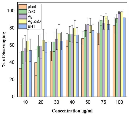 The antioxidant activity of the bimetallic NPs was also high compared to the monometallic NPs of ZnO and Ag and the standard BHT, at a low concentration of 10 µg/mL. At this concentration, the scavenging effect of the Ag/ZnO NPs was the highest (65%), followed by the Ag NPs (56%), the BHT (54%), the ZnO NPs (53%), and the plant extract (33%). The percentage of the scavenging effect varied at different concentrations of samples (Figure 6). The presence of different phytochemicals in the samples may account for the differences in their antioxidant scavenging effect.