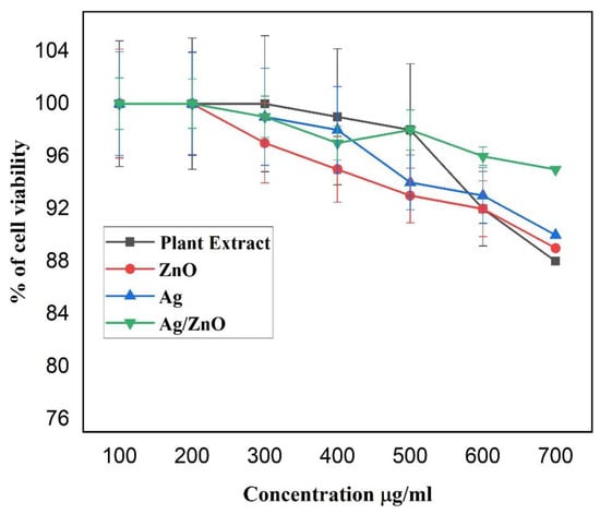 The plant extract did not show any harmful effects on the cells at concentrations of 100, 200, and 300 µg/mL. However, the plant extract above 300 µg/mL reduced the cell viability. The viabilities of the cells treated with the ZnO NPs were 100%, 100%, 97%, 95%, 93%, 92%, and 89%, at concentrations ranging from 100 to 700 µg/mL. For the Ag NPs, at concentrations ranging from 100 to 700 µg/mL, the cell viabilities were 100%, 100%, 99%, 98%, 94%, 93%, and 90%, for the same concentrations. The Ag/ZnO NPs showed viabilities in the range of 100%, 100%, 99%, 97%, 98%, 96%, and 95% in the same range.