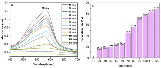 The ability of the Ag/ZnO NPs to degrade MV was investigated by adding 5 mg of the nanoparticles to destabilize 10 ppm of the MV within 120 min. The degradation rate was monitored by measuring the absorption spectra of the solution at 10 min intervals to determine the dye concentration. The MV solution exhibited absorption bands at 582 nm and 334 nm, respectively, and the absorbance decreased over time, indicating the decay of the MV (Figure 8a). Moreover, the color of the solution became fainter as the dye was progressively degraded. The observed removal rate of the MV was 88.93% after 120 min.