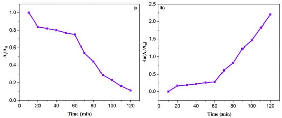 Variation of At/A0 (a) and ln (At/A0) (b) with time for Ag/ZnO NPs in the degradation of MV.