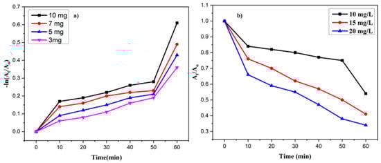 Variation of At/A0 (a) and ln (At/A0) (b) with time for Ag/ZnO NPs, in the degradation of MV, using different dye concentrations.