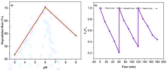 The degradation of the MV dye was carefully monitored under different pH values (pH 3, 6, and 9), using a dye concentration of 10 ppm, as depicted in Figure 11a. To achieve the desired acidic and basic pH levels, concentrated HCl and NaOH were added in varying concentrations to the dye solution. The obtained results reveal a notable removal rate at acidic pH levels, which gradually decreased as the pH became more alkaline.