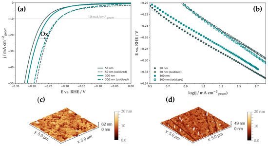 The obtained HER polarization curves were further processed using Tafel analysis. The linear sections of the Tafel plots (Figure 2b) were extrapolated to η = 0 V to extract exchange current densities (j0). The summarized HER kinetic data (Table 2) indicate a minor effect of surface oxidation on the Tafel slopes, while the exchange current densities are increased by a factor of 3.2 for the 50 nm film and by 4.8 for the 300 nm film. For the HER on Ni metals of various morphologies, there are reports of Volmer–Tafel and Volmer–Heyrovsky reaction mechanisms, as well as mixed forms [48]. However, at higher overpotentials, where Tafel analysis was performed, the Heyrovsky reaction path is considered the rate-determining step in a successive combination of the Volmer and Heyrovsky mechanism. In contrast, the Tafel step is considered negligible in this potential range [49]. AFM analysis (Figure 2c,d and Figure S3) of the as-deposited thin films showed comparable surface roughness and was only slightly affected by surface oxidation. This finding indicates that the RFs (Table 1) hardly changed upon anodic treatment and remained effectively equal to 1. Thus, the calculated exchange current densities are considered to correspond to those evaluated for the electrochemically active surface area.