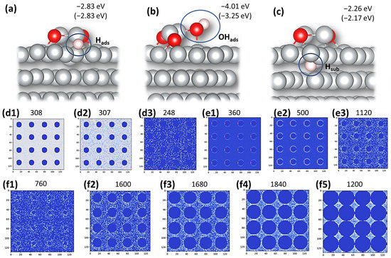 KMCLib v1.1 [34] was used for all Kinetic Monte Carlo (KMC) simulations. All elementary processes (rare events) with their assumed reaction rates, along with the initial configuration of the system, defined on a regular grid in space, were provided to the code. The systems were then propagated in time on the free energy landscape defined by the provided elementary processes and rates. Simulations were provided enough time to equilibrate, and the statistics were then collected, including integral H2 production rates and spatial maps of H2 production (normalized from 0 to 1). The initial configurations of the systems were defined on a 130 × 130-points grid which was first populated with metallic sites (Ni), and then circular islands of oxidized Ni phase (OX) were placed on the surface. The set of elementary processes involved reactions (1–3) and considered possible water dissociation at the Ni|OX interface in such a way that Hads is formed on Ni sites, while OH− does not remain adsorbed at OX (much faster removal of OH− compared to other rates in the system). Thus, the reaction is analogous to the Volmer step but only occurs at the Ni|OX interface. Water dissociation at the Ni|OX interface and clean parts of the Ni surface were considered independent and mutually affected indirectly only by the amount of Hads at Ni sites. In addition, surface diffusion of Hads at non-modified parts of the Ni surface was also included in the model. As explained in previous works [15,35], the rates of the considered elementary processes were 10n (with n being an integer number), and were then systematically varied to analyze the effects of the rates of the elementary processes on the total H2 production rate.