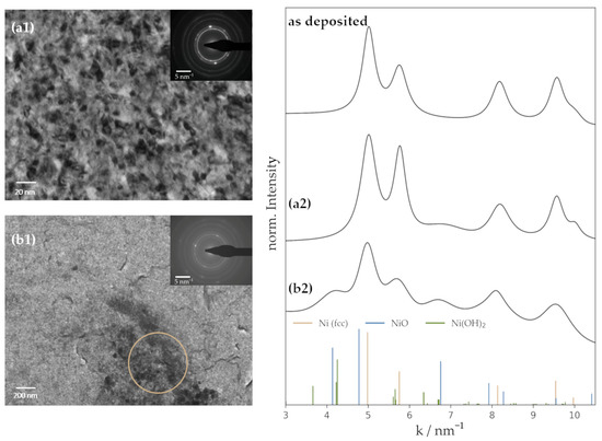 TEM and SAED analysis of a 50 nm Ni film after 100 cycles of the stability test. (a1) TEM bright-field image of a representative spot and (b1) of surface alterations (highlighted region) as well as corresponding diffraction profiles obtained by azimuthal integration of the SAED patterns (a2,b2). The profile of the as-deposited layer and theoretical reference peaks are displayed for comparison [62].