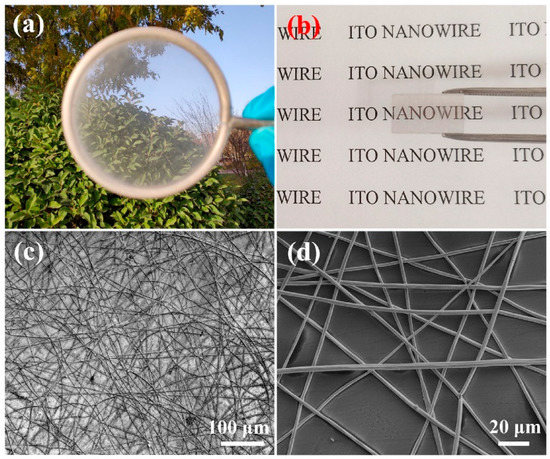 (a) Physical image of ITO NW film; (b) The INTCE obtained by transferring ITO NW film to a quartz substrate; (c,d) SEM images of ITO NW networks with different magnification.