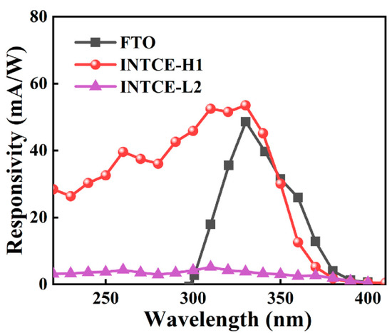 Most importantly, we tested the spectral response performance results of PEC UV detectors based on INTCEs and high-temperature sintering methods. For comparison, we prepared a conventional FTO-based device using the same active layer deposition process. As shown in Figure 7, owing to the advantages of the broadband semiconductors, the devices all exhibited good visible light-blind characteristics. The FTO-based device was affected by the light filtering effect and only gave a peak response at 300–400 nm. In line with our expectations, the INTCE-Based PEC UV detectors had a continuous response in the 200–400 nm range and achieved appreciable responsiveness, which is of key importance for the application of the device in the UVB (275–320 nm) and UVC (200–275 nm) ranges. Benefiting from the advantages of the high-temperature method, the response of INTCE-H1 was substantially better than that of the low-temperature device, with a peak response at 332 nm of 56.1 mA/W. This value was also much higher than similar devices based on Ag NW electrodes (15.1 mA/W) [12].