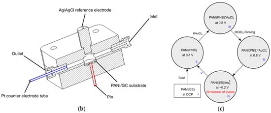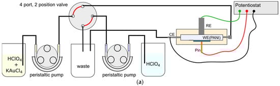The whole experimental setup is shown in Figure 1a. In contrast to previous work, we used a platinum tube as CE at the flow cell outlet [17,18,19]. The Au insertion process requires a continuous control of the applied potential on PANI during the AuCl4 exposure. To this end, a cross-flow cell (Figure 1b) was designed, where the RE (screw type RE-3VT, ALS) is placed directly above the WE. The fluidic setup further consisted of two peristaltic micropumps (model 400FD, Watson Marlow), a chemical inert 4-port, 2-position valve (Vici Valco) and two solution reservoirs as well as a waste reservoir. All fluidic connections were made using teflon tubes. A compact potentiostat was used for the electrochemical control (Emstat3+, PalmSens, Houten, Netherlands). All hardware was controlled by a C# program which also allows to run fully automated deposition sequences.