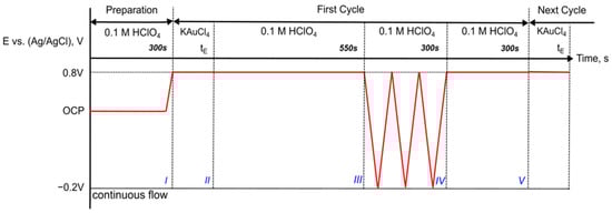 The detailed timing diagram of the stage transitions from I to V including the experimental parameters is shown in Figure 2 and Table 1 for the Au deposition process in PANI. Four different sample groups erre prepared. In group A, the exposure time (tE) of AuCl4 was varied from 1 min to 16 min without any intentional CV reduction step. In contrast, group B represents samples of a single complete deposition cycle with different exposure times ranging from 1 min to 16 min. Furthermore, a total sequence ranging from 1 to 6 cycles was achieved with a constant exposure time of 1 min for each cycle (group C). An additional single cycle deposition with 1 mM KAuCl4 solution was performed to evaluate the role of the precursor concentration (sample D).