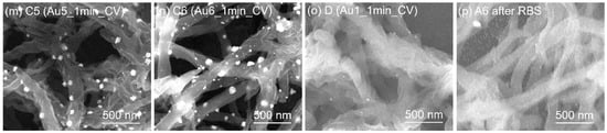 The corresponding representative SEM images of the samples are shown in Figure 4. The samples exhibit the typical nanofibrillar PANI morphology and show the typical electrochemical behavior as observed in literature [22,23,24]. For a single cycle of Au deposition without any intentional reduction by CV (group A), no NPs are observed with the increase of exposure time from 1 min to 16 min, as shown in Figure 4a,b. A similar result is observed in Au [1c, 1 min, CV] (sample B1), where exposure time is also 1 min albeit it is followed by an additional CV for AuCl4 reduction. For Au [1c, 2 min, CV] (sample B2, Figure 4d), a small amount of isolated small NPs in the range of about 5 nm can be found. As the exposure time increases, the density of NPs increases and larger aggregates of up to several hundred nanometers can be observed, as indicated in Figure 4e–h. Clearly, compared with group A, the reduction using the CV results in the nucleation and aggregation of Au NPs in group B. A similar phenomenon is observed for group C when the number of Au deposition cycles increases (Figure 4i–n). As can be seen in Au [2c, 1 min, CV] (sample C2, Figure 4j), NPs already start to appear clearly when the exposure time is only 1 min for each cycle. For a total net exposure time of 2 min, only rare occurrences of NPs are found in both Au [1c, 2 min, CV] and Au [2c, 1 min, CV] respectively. With the stepwise increase of Au deposition cycles, the density and size of NPs grow (Figure 4k–n). It appears that in group C (cycle number variation), the NPs are more finely dispersed and have a higher density than in group B (single reduction step). This indicates that each insertion cycle creates new NPs. Compared with Au [1c, 1 min, CV], a tenfold increase of the AuCl4 concentration already leads to the appearance of NPs in sample D after a single full deposition cycle (Figure 4o). It is interesting to note that after the He ion bombardment in the RBS measurement, extremely tiny NPs (2–4 nm) are found in the measurement spot of Au [1c, 16 min, no CV] (Figure 4p). It indicates that Au was initially well-dispersed in PANI, but the high He ion energy resulted in the formation of Au NPs significantly smaller than the CV reduction in solution.