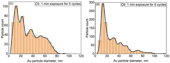 As can be seen from SEM pictures, we could not detect NPs in group A within the resolution of the SEM. Further supportive TEM analysis is presented in the following section. In group B, the extremely low density and irregular shape of the NPs render any analysis on size distribution challenging. Therefore, we only took a closer look at group C for samples that have been prepared with 3 or more cycles. The results are shown in Figure 5. It can be seen that the NP dispersion does not follow a continuous dispersion law. Interestingly, there seems to be a common region ranging from around 5 to 20 nm. The density of this portion of NPs significantly increases with the number of cycles. Compared with Au [3c, 1 min, CV] in Figure 5a, the already existing 5–20 nm, 25–30 nm and 40–50 nm regions still remain for Au [4c, 1 min, CV] in Figure 5b, and additional peak regions located at 60–70 nm and 75–80 nm are found. Furthermore, the different size peak regions continue to exist also in Au [5c, 1 min, CV] and Au [6c, 1 min, CV] in Figure 5c,d. The total density of NPs quantitatively increases from about 12 NPs/µm2 in Au [3c, 1 min, CV] to 34 NPs/µm2 in Au [6c, 1 min, CV].
