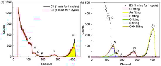 RBS was measured for all samples as it allows to quantitatively determine the amount of Au deposited on or in the PANI film. The resulting spectra are very similar for all samples except for the Au-related peak. As an example, we plot in Figure 9a the spectra of two samples with the same net total exposure time of 4 min. Before we discuss the details, we first describe the general observations of all measured spectra. Two isolated peaks can be observed around channel 275 and channel 400, which can be assigned to Cl and Au, respectively. The peak area is directly proportional to a given elemental concentration, whereas the peak width is indicative of the elemental depth distribution. The low energy tailing of the peaks can be explained by the corrugated PANI surface as a result of the nanofibrillar morphology. As such, the apparent film thickness “seen” by the detector is not constant. Additionally, we can observe peaks for F, O, N and C at channels 180, 160, 140 and 110, respectively. However, there is a significant overlap of the peaks due to the film thickness and corrugation as well as the low difference in atomic number between these elements. Therefore, the elemental concentrations of N and O were determined in the following way. First, the Cl-peak was fitted with an asymmetric function. As the Cl is stemming mostly from the perchlorate anion which is needed for charge compensation in the PANI film, it is reasonable to assume that the Cl profile matches the PANI profile. Second, the same fitting parameters except for the scaling factor and translational variable were used for O and N. In this way, the true area of the latter elements could be determined and used for the elemental quantification, as shown in Figure 9b. The same procedure was also applied to fit the Au peak. From Figure 9a, it is apparent that the Au peak shapes for Au [1c, 4 min, CV] and Au [4c, 1 min, CV] are different. For Au [4c, 1 min, CV], a single steep peak of Au without a plateau region is observed. It indicates that the majority of deposited Au is located on the top surface of PANI. Instead, for Au [1c, 4 min, CV], the Au peak forms a plateau, indicating a more homogeneous depth distribution of Au. Please note that the plateau region is observed for all samples with just one deposition cycle. Interestingly, the Au peak can be fitted with the same fitting parameters as Cl (Figure 9b) for all one cycle samples, indicating a quite homogenous depth distribution of Au in the PANI film. However, as more deposition cycles are added, the Au peak gradually changes into a sharp peak which points towards surface aggregation of Au.
