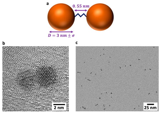 (a) Schematic representation of a CdSe quasi-homodimer. The dimer is assembled by covalently bonding two QDs with a 0.55 nm ligand. The QDs are drawn from an ensemble with a mean diameter, , of 3 nm and size dispersion, . (b) A high-resolution transmission electronic microscopy (HR-TEM) image of one of the quasi-homodimers prepared for this work. (c) A larger TEM micrograph of the CdSe QDs dimers.