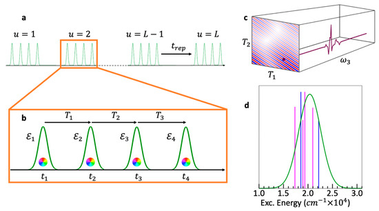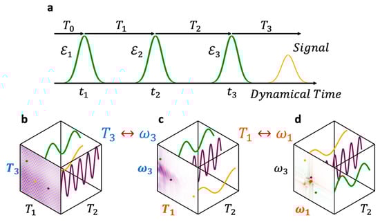 This produces a cube of data for the polarization of the ensemble in the rephasing direction in the time–frequency domain, as shown in Figure 2d. These computed data can be directly compared to the data measured in the BOXCARS setup in the time–frequency domain.