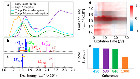 All these coherences, both intra- and inter-band, are interdot in character, due to the delocalization of the wavefunctions of the FS states over the whole dimer [7]. The horizontal double-headed arrows superimposed onto the dimer stick spectrum (Figure 3b) identify these four coherences, and their calculated frequencies, periods, inhomogeneous dephasing times, and emission dipole strengths are presented in Table S3 of Section S3 of the Supplementary Materials. Throughout this work, the coherences are labeled in cyan, and the , , and coherences in purple, green, and orange, respectively.