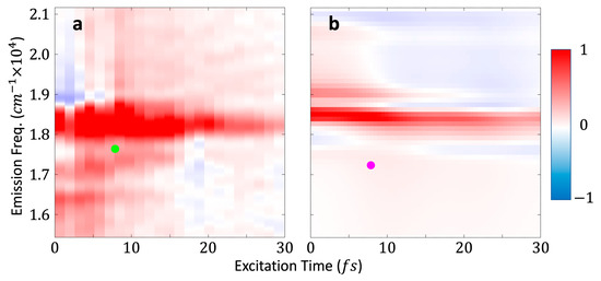 (a) Measured dimer sample and (b) calculated dimer (,) maps at = 20 fs after the rotating frame has been applied. The green and pink dots correspond to the locations where traces along T2 were taken, from which the FTs in Figure 5 were produced.